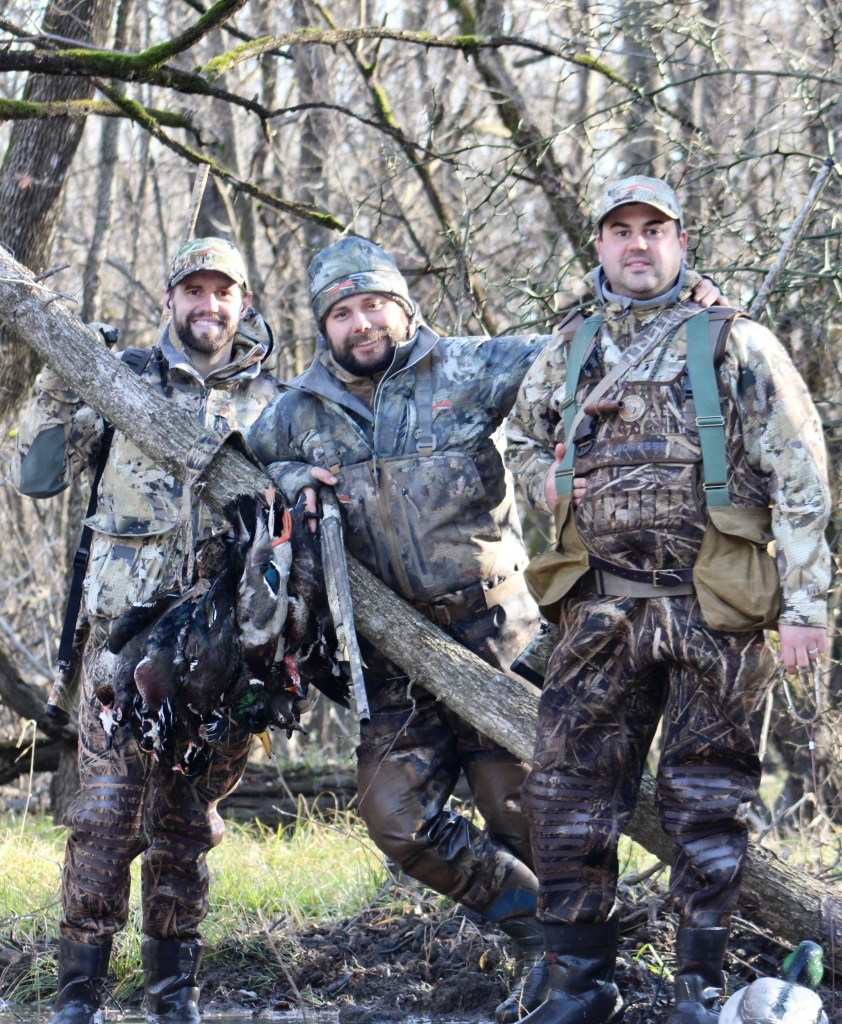 We unloaded decoys and dogs and started to set up our spread, strategically positioning woody and mallard decoys along with a mix of motion decoys.  Just as the scouting report had drawn it up, 5 min before shooting light came the first group of woodies.  We watched them splash in, wave after wave, it was fun to watch.  Once shooting light arrived, we took aim on the next group and the water below us exploded with birds exiting at the sound of guns.  We had our limit in about an hour and headed back to the house to cook up a big country breakfast on the Blackstone griddle.  A few of us cleaned birds while the others sorted gear, dogs and breakfast.  It was a great morning and a great way to think about anything else, even if only for a few hours.